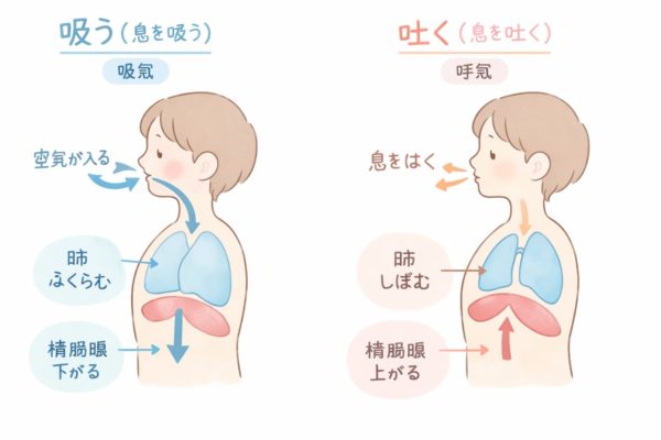 - 呼吸は「吸う」より**「吐く」**が大事